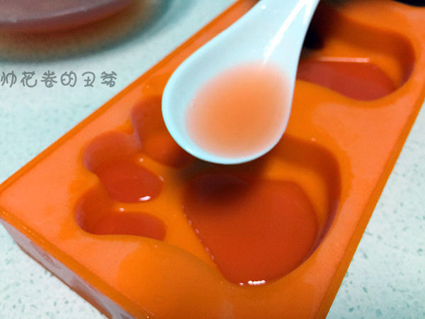 第二步,制作粉红色部分:草莓汁兑酸奶,倒入模具肉垫部分凹槽,冻上2小时。