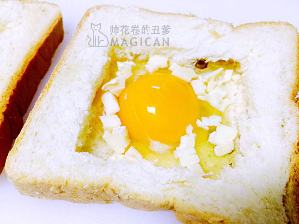 在面包中央用刀割一个正方形(要轻,不要割到底)然后用勺子压下去,中间打一颗鸡蛋。
